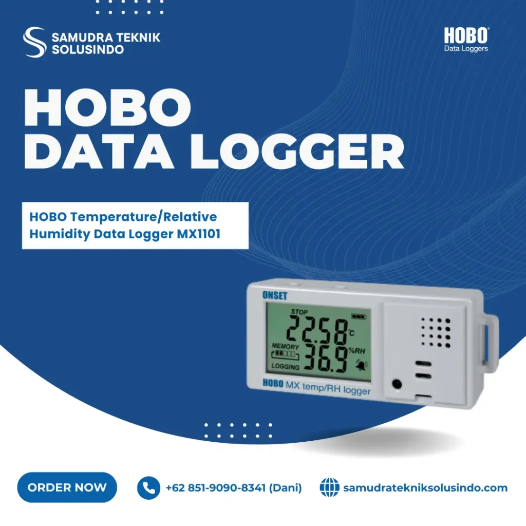 HOBO MX110 adalah data logger berbasis Bluetooth yang digunakan untuk memantau suhu dan kelembapan di dalam ruangan. Data dapat dilihat langsung melalui aplikasi di ponsel, sehingga sangat praktis untuk pengecekan cepat.