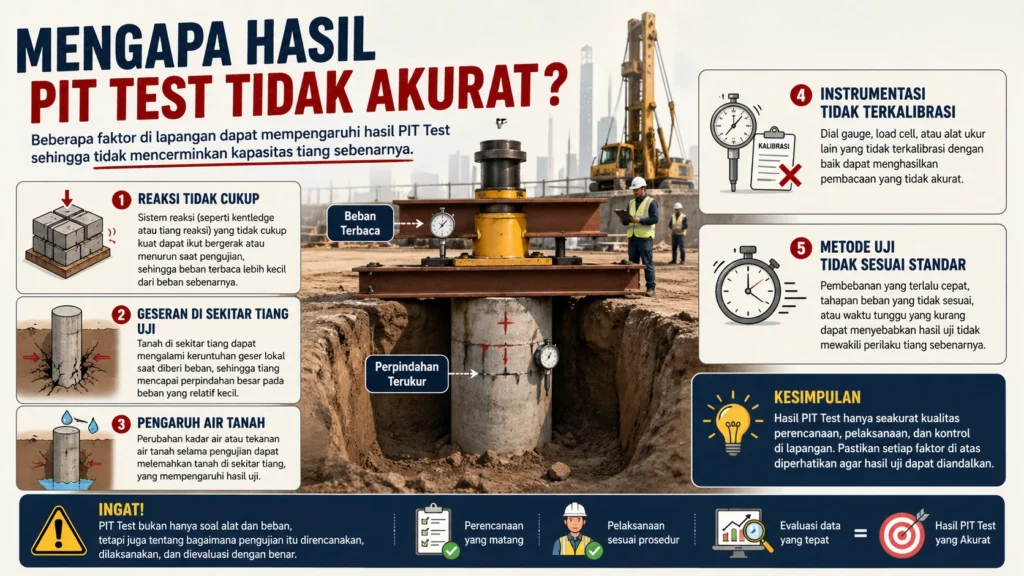 Ketidakakuratan hasil pengujian dapat disebabkan oleh berbagai faktor, mulai dari kondisi fisik tiang, kesalahan teknis, hingga faktor lingkungan dan pengalaman engineering. Dampaknya pun tidak bisa dianggap sepele, karena dapat memengaruhi biaya, waktu, hingga keselamatan proyek secara keseluruhan.
